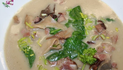 Polévka z uzeného masa, čerstvého špenátu a sušených hub
