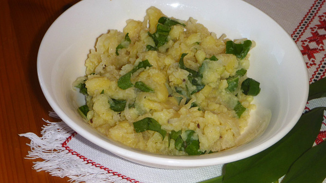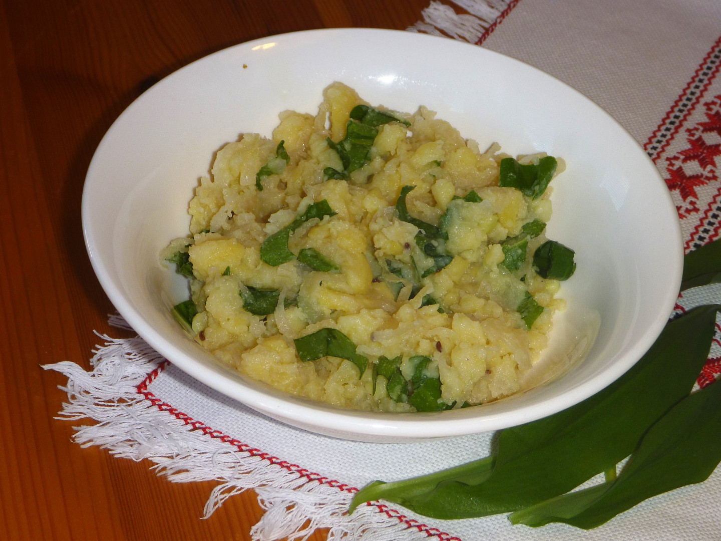 Brambory uvaříme, rozšťoucháme a promícháme s kysaným zelím, opečenou slaninou a cibulí. Nakonec přidáme medvědí česnek, který dodá pokrmu svěží chuť. Tradiční jídlo v moderním pojetí, ideální jako příloha nebo samostatné jídlo.
