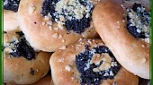 Krok 2: Poté těsto rozdělíme na 30 dílů. Z každého vytvarujeme placičku a pokládáme na plech s teflonovou fólií nebo papírem na pečení. Pak placičky potřeme rozpuštěným máslem, dáme libovolnou nádivku (mák, povidla, tvaroh) a posypeme drobenkou.