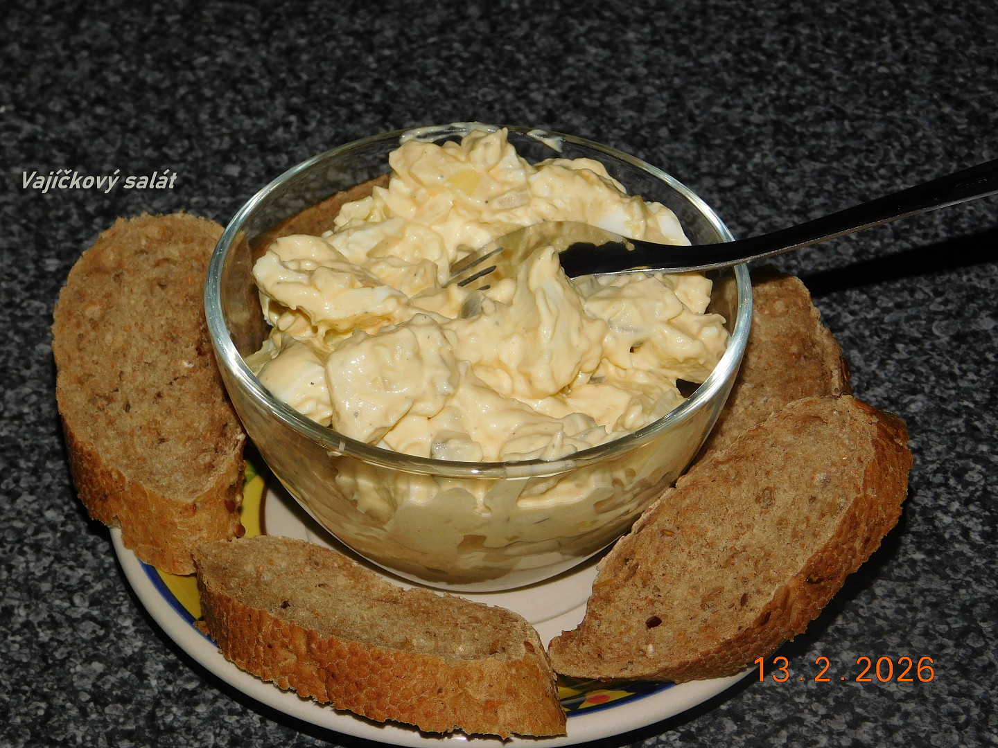 Vajíčkový salát s čerstvě upečenými voňavými rohlíčky.