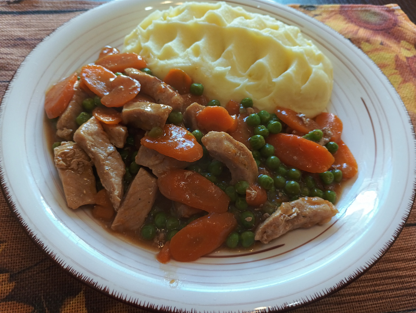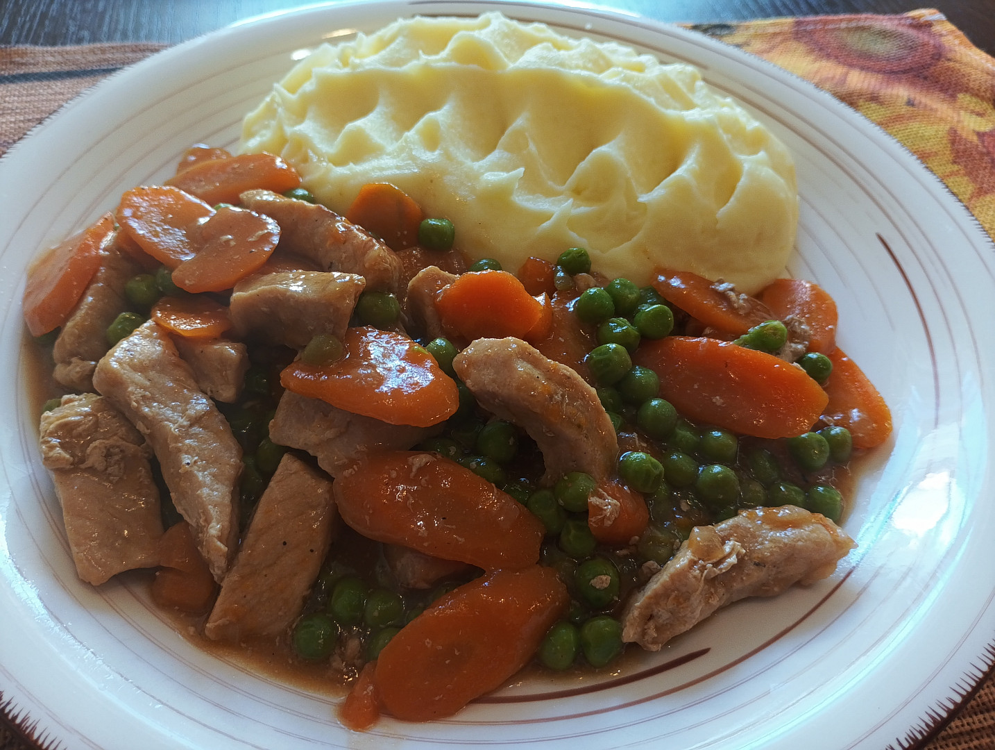 Omáčka z vepřového masa s hráškem a mrkví.