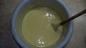 Krok 5: Celá vejce vyšleháme s cukrem a špetkou soli do pěny, přidáme olej, mléko a vmícháme prosátou mouku s kypřicím práškem. Dobře promícháme, až vznikne hladké těsto a vlijeme ho na připravený hluboký plech.