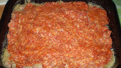 Krok 4: Lehce vymazaný a strouhankou vysypaný pekáč pak naplníme polovinou zelí, na něj navrstvíme směs z mletého masa a na něj zbylou vrstvu zelí a v předehřáté troubě zapékáme asi 25 minut.