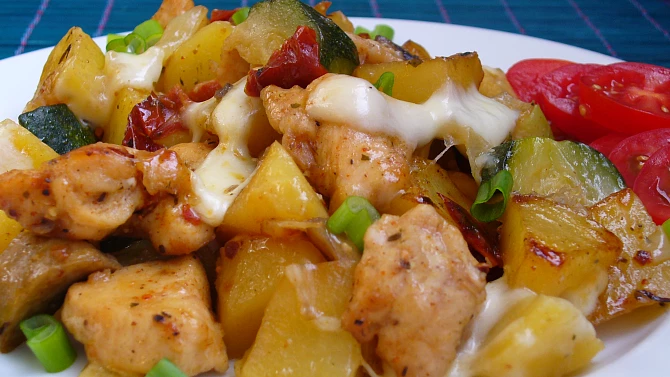 Šťavnaté kuřecí maso, pečené s bramborami, křehkou cuketou a žampiony, je ideální pro rodinné večeře i slavnostní příležitosti. Pečení v troubě zajišťuje, že všechny ingredience jsou dokonale propečené a propojené.
