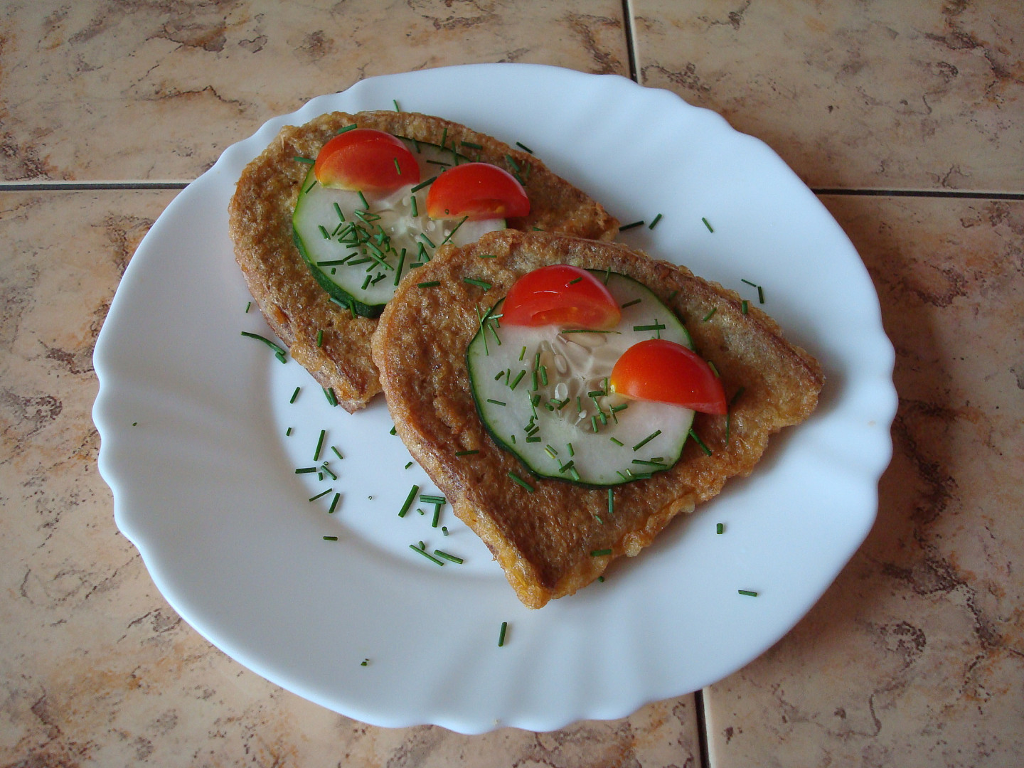Krok 2: Osmažíme na oleji, přebytečný tuk odstraníme papírovou utěrkou a ozdobíme rajčetem a okurkou.