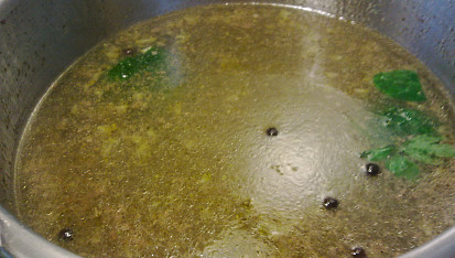 Krok 2: Přilijeme vodu a vhodíme nové koření, libeček, bobkový list, pepř, sůl, brokolici a nakrájenou mrkev a uvaříme vše do měkka.