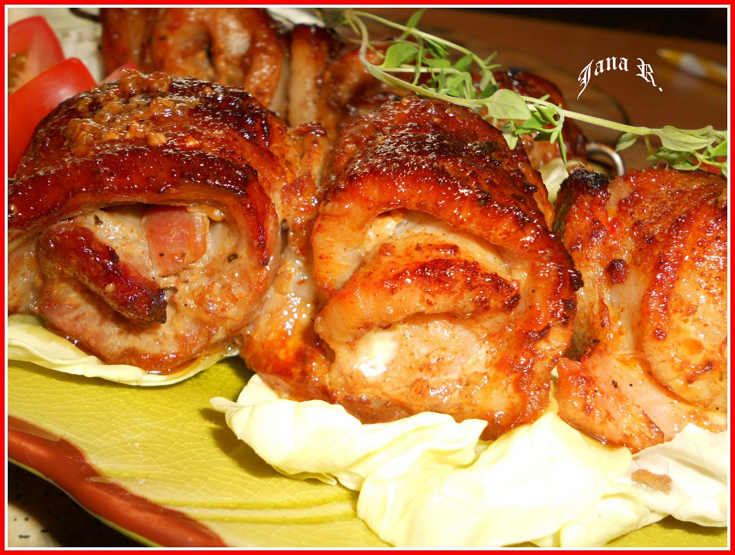 Krok 4: Na druhý den každý plátek bůčku srolujeme do ruličky a napícháme na jehly, na každou 3 kusy.