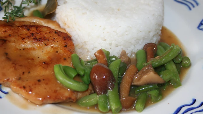 Krok 6: Kuřecí řízky na žampionovo-fazolkové směsi přeléváme vypečenou šťávou a podáváme s dušenou divokou rýží.