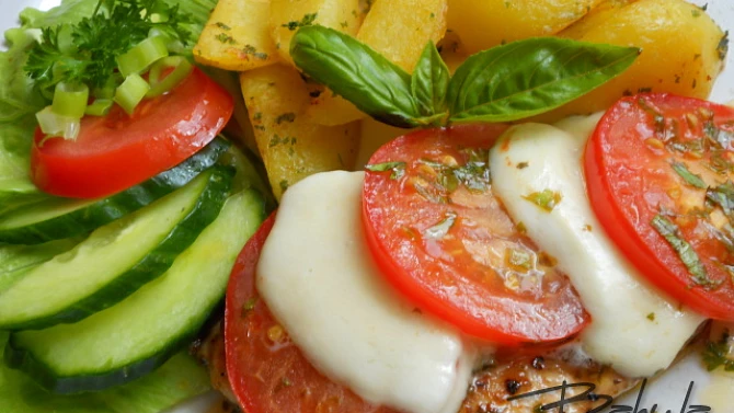 Krok 8: Ty klademe na teplá kuřecí prsa a prokládáme je Mozzarellou, aby se mírně rozpustila a ihned podáváme.