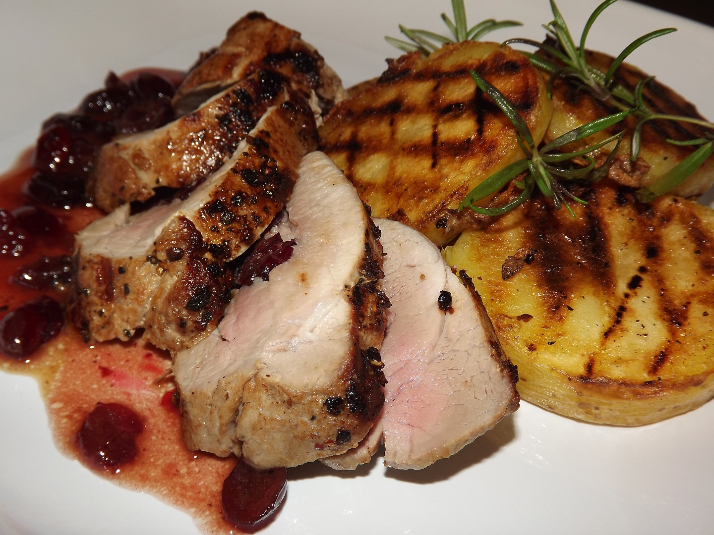 vepřová panenka plněná sušenými švestkami a brusinkovou omáčkou,