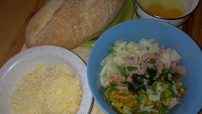 Krok 1: Salám nebo šunku pokrájíme na malé kostičky, sýr nastrouháme. Česnek s cibulí oloupeme, cibuli pokrájíme nadrobno a česnek prolisujeme. Papriku očistíme, vykrojíme jádřince a nakrájíme na kostičky. Bylinky omyjeme a pokrájíme nadrobno.