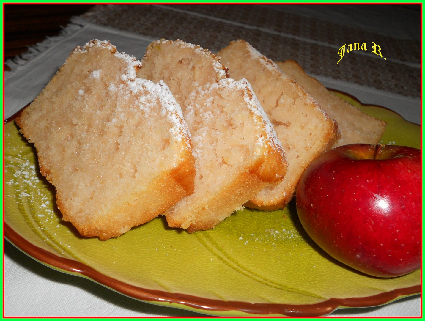 Byla sladká úplně akorát,krásně voňavá a druhý den po jablíčkách úžasně vláčná. Škoda jen,že nemám fotku na řezu,vezla jsem mu celý plech.Dělala jsem na menší plech,takže byla opravdu krásně nadýchaná a docela vysoká