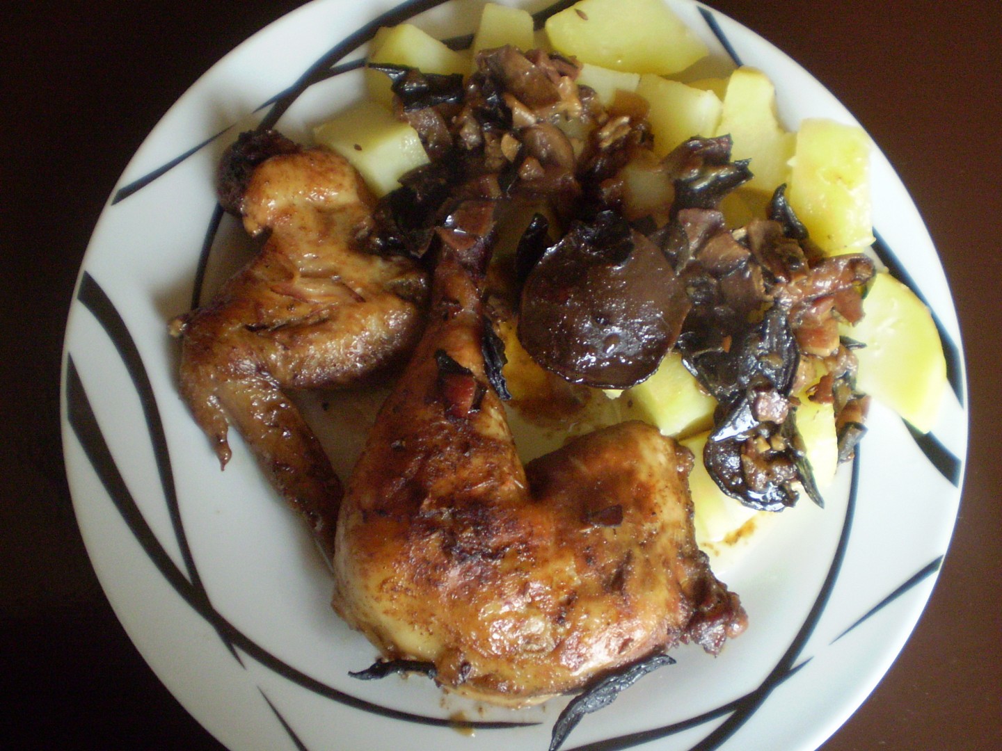 Kuře na divoko vás okouzlí svou kořeněnou slaninovou vůní. Houby s cibulí, jablky a česnekem pečené s masem vytvoří úžasnou omáčku, která se bude skvěle hodit k bramborám, rýži nebo hrnkovým knedlíkům.