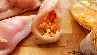 Krok 5: Zeleninovou směsí naplníme kuřecí filety a dutiny spíchneme párátkem.