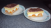 Krok 5: Na kakaový korpus dáme 1/3 náplně, poklademe meruňkami a na ně rozetřeme 2/3 náplně. Přikryjeme světlým korpusem a potřeme zbylou náplní. Povrch posypeme čokoládou.