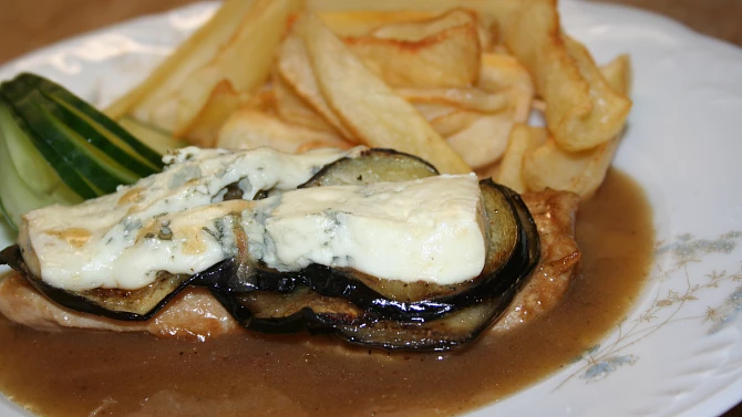 Krok 7: Na hotové plátky masa poklademe opečená kolečka lilku, navrch položíme plátky rokforu a vložíme do trouby asi na 10 minut, až se sýr nataví.