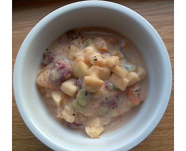 Vše nakrájíme na drobné kostičky, zamícháme, přidáme trochu cukru a tak 2 lžíce zakysané smetany, někdo může dát bílý jogurt. Krok 2: Ten cukr podle chuti a potřeby, jak je ovoce kyselé. Je lepší dávat čerstvé ovoce, ale na čerstvé jahody je můj syn alergický a tak musím upravit podle něj a dávat kompotované. Krok 3: Před podáním je dobré opravdu pořádně vychladit, na léto bezva, my jíme celoročně.