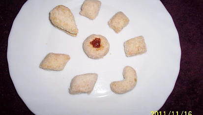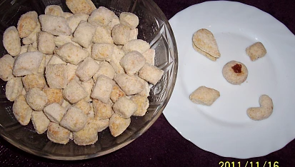Krok 4: Teplé obalovat v moučkovém cukru smíchaném s vanilkovým cukrem. Z těsta je také možno tvarovat rohlíčky, důlkové koláčky, nebo vyválet a vykrajovat různé tvary a upečené slepovat.