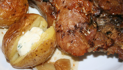 Vepřové ocásky na kmínu s pečenými brambory a pažitkovým dipem