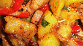 Krok 5: Do pánve Wok, která byla použita na opečení masa, vložíme na kostičky nakrájené syrové, ale již ochucené brambory a za stálého prohazování opékáme do zlatavé barvy a hlavně do měkka. Před dokončením zlehka poprášíme mletou paprikou.