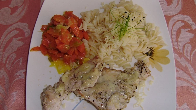 Kuřecí plátek s dušenou mrkví a těstovinou