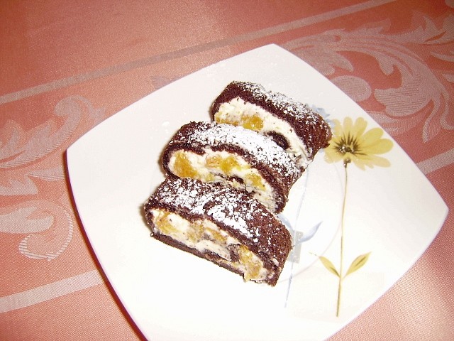 Krok 2: Poté ještě horkou roládu zarolujeme i s pečícím papírem, jakmile těsto vychladne, natřeme smetanou s mandarinkami a zarolujeme do rolády.