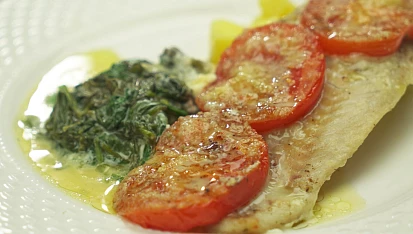 Rybí filé na špenátosýrovém lůžku s rajčatovou čepicí