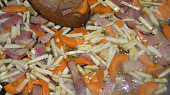 směs mletého masa obalené anglickou slaninou pečené na cibuli