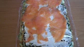 Krok 4: Upečený plát necháme vychladnout, překlopíme na potravinářskou fólii, odstraníme pečicí papír, potřeme sýrem, poklademe plátky lososa a pevně zavineme. Zabalíme do fólie a necháme v lednici ztuhnout.