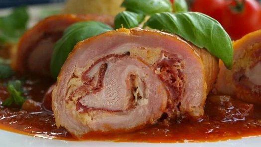 Krok 1: Plátky mäsa naklepeme, osolíme, opepříme. Na každý plátok položíme 4 umyté listy medvedieho cesnaku, kúsok Eidamu, kúsok Hermelínu, zvinieme, obalíme slaninou.