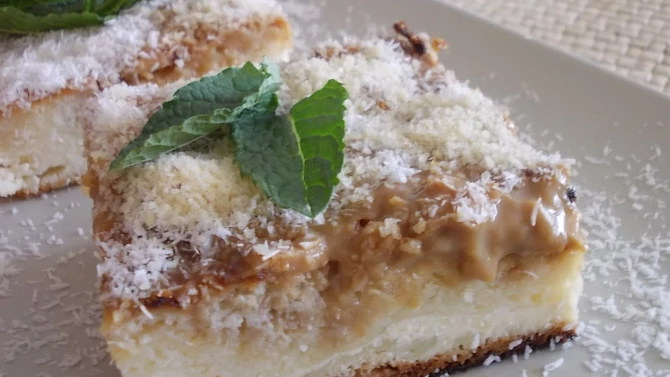 sypany kolac s jablky tvarohem a karamelovym pudinkem,