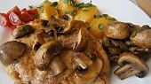 Vykostila jsem si 4 kuřecí stehna,použila 17ks menších žampionů překrojených na polovinu a stačilo mi jedno vejce rozmíchané v necelé decince mléka.Oleje jsem použila do vody s masoxem o něco míň a brambory překrojené na polovinu jsem dala pod maso,takže bylo vše i s přílohou zhotovené v bezva šťávě najednou.Moc jsme si pochutnali