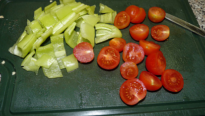 Krok 6: Když jsou hlavně brambory poloměkké (maso už by mělo být měkké)přidáme nakrájenou papriku a rajčátka a ještě vlníme cca 5 min. Zelenina by měla být na skus, ne rozvařená, ale ani ne tuhá (hlavně brambory)