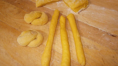 Krok 1: Z mouky, vajec, cukru a soli vypracuji těsto. Po vypracování rozdělím těsto na půlky, čtvrtky, osminky…. Z rozděleného těsta vyválím na malíček silné válečky cca 20 cm dlouhé.