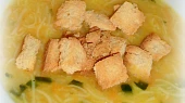 Krok 4: Do polévky nasypeme nudle (množství, jak kdo má rád) a necháme vařit do změknutí. Nakonec posypeme nasekanou petrželkou. Servírujeme s opečeným toustovým chlebem (toustový chléb nebo rohlíky si nakrájíme na kostky a na pečícím papíru opečeme v troubě rozehřáté na cca 170 stupňů do hněda).