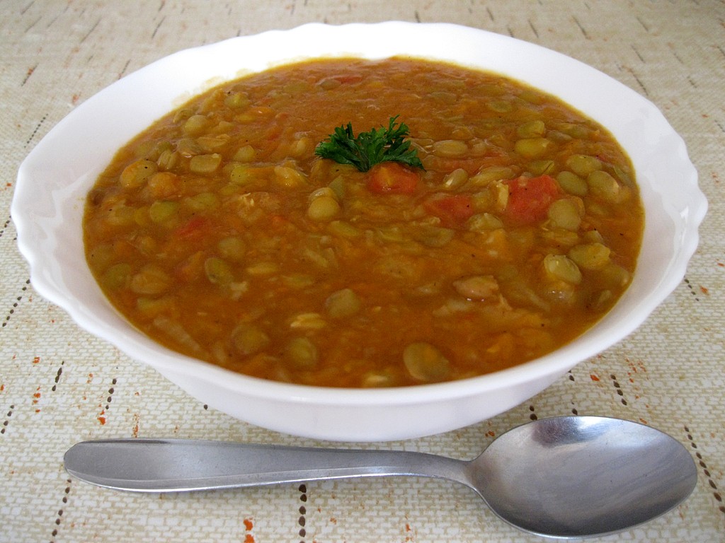 Krok 3: Od bodu varu vaříme 25-30 minut, podle potřeby můžeme dolít vodu, ale jen tak, aby sahala těsně nad čočku. Je-li směs příliš řídká, můžeme zahustit lžičkou mouky rozmíchané v malém množství studené vody. Na závěr dokořeníme podle chuti.