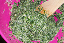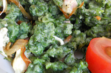 Špenátové halušky s osmaženou cibulí, Nivou a šunkou
