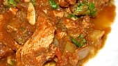 Krok 3: Paradajky nakratko ponorime do vriacej vody a osupame ich, nakrajame na kocky a pridame do voku, porestujeme, pridame marinovane kurca a susene rozdrvene cili papricky, zo vsetkych stran riadne premiesame a zalejeme trochou vody, aby sa nam vytvorila kompaktna zmes.