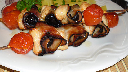 Šťavnaté kuřecí špízy se slaninou, sušenými švestkami a cherry rajčátky nabízejí harmonii sladkého a slaného. Jemné maso, křupavá slanina a sladké švestky tvoří lahodný, barevný a jednoduchý pokrm vhodný na večeři i grilování.