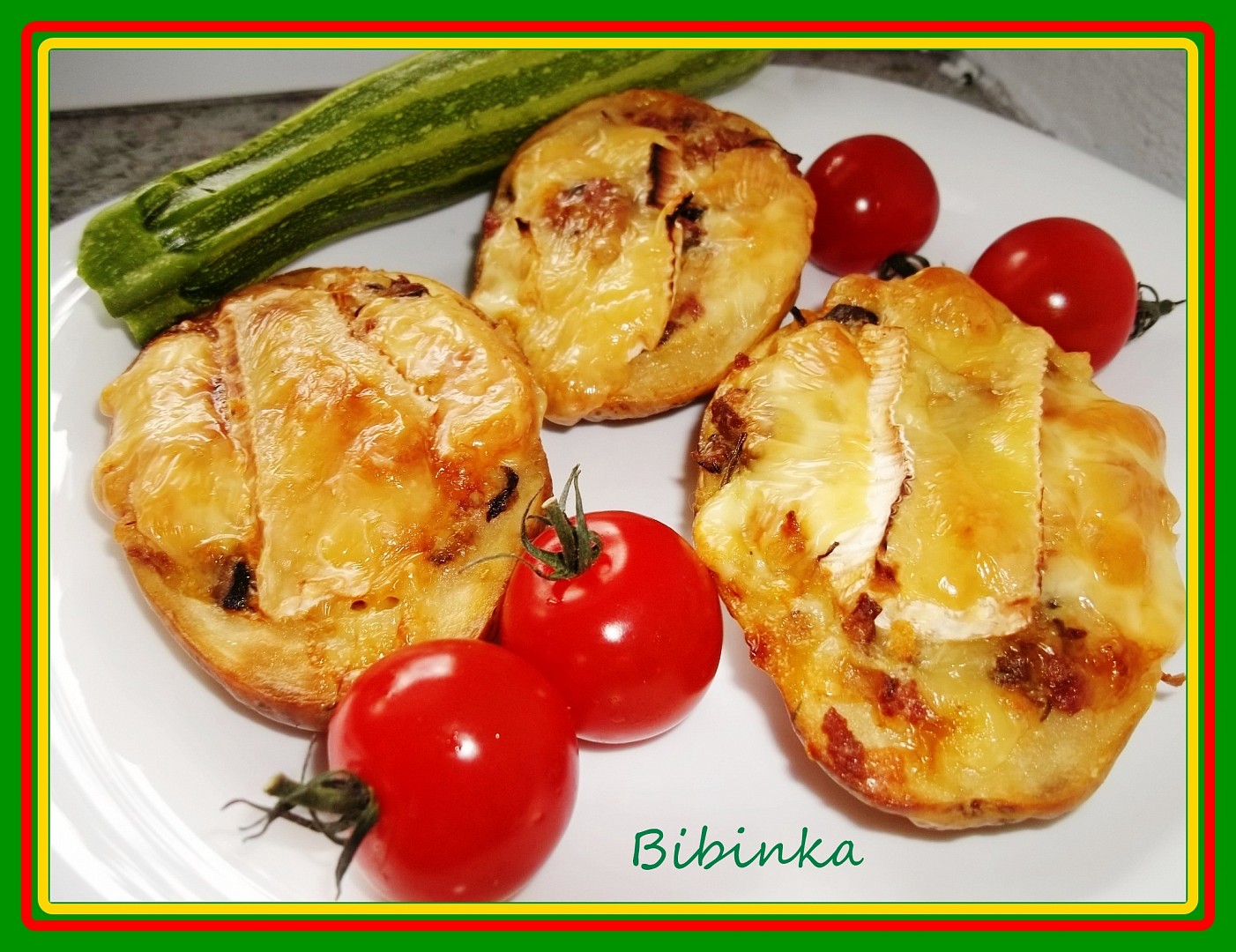 Všechno promícháme a malou lžičkou plníme brambory do vrchovata. Navrch položíme plátek Hermelínu na každou půlku a 2 kousky Eidamu ze stran Hermelínu, aby byl pokrytý celý vršek brambor. Krok 4: Dáme na pekáček, nebo plech a zapečeme ve vyhřáté troubě na 200°C asi 15-20 minut a jdeme si pochutnat.