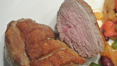 Krok 1: Kachní prso na kůži nařežeme do mřížky, vetřeme do něj sůl a pepř. Pánev na sucho rozpálíme a položíme na něj prso nejprve kůží dolů, necháme pořádně dohněda opéct, obrátíme a opečeme i z druhé strany již na mírnějším plameni.