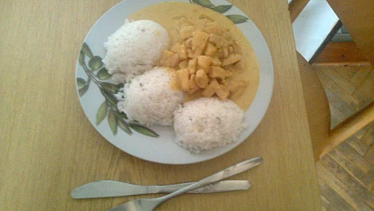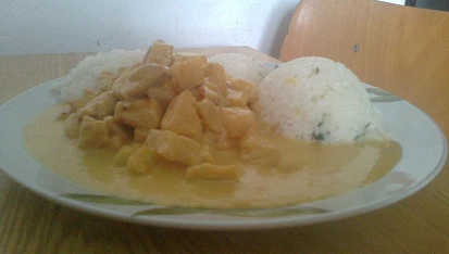 kuřecí na kari a smetaně s ananasem s těstovinami,