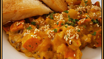 Krok 4: Mezitím na suché rozpálené pánvičce prudce osmahneme zbývající lžíci sezamového semínka, kterým pak společně s petrželkou posypeme hotový pokrm. Podáváme s lehce osmaženým bílým pečivem, které můžeme mírně očesnekovat.