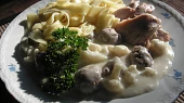 Krok 2: Jíšku z másla a hladké mouky zalejte vývarem, povařte a vlijte smetanu, vložte syrové játrové knedlíčky a pomalu povařte asi 10 minut tak, aby byly uvařené. Do omáčky vložte růžičky květáku a obrané maso ze slepice. Podávejte s těstovinami nebo noky.