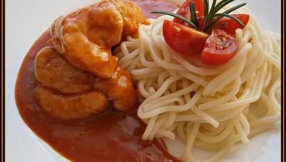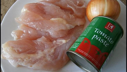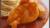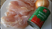 Horste,dovolila jsem si přidat fotky i s postupem vaření.Jen jsem si gramáž přizpůsobila pro 2 osoby a maso-kuřecí prsa(300g) jsem nekouskovala,ale udělala plátky.Protlaku jsem na 1/2l vody dala 3/4 balení.Z celé plechovky by byla omáčka nahořklá