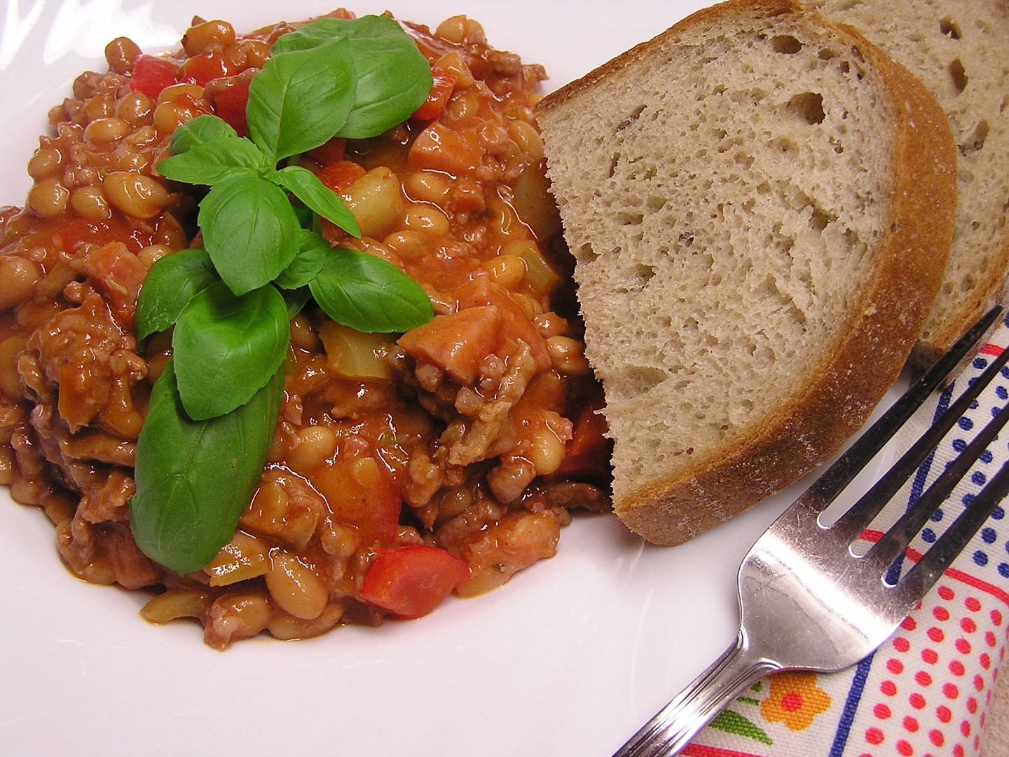Krok 5: Papriky umyjeme, zbavíme jadřinců, nakrájíme a přidáme k masu, krátce osmahneme, přidáme rajčata, fazole, necháme provřít. Podáváme s pečivem.