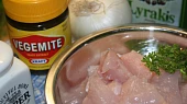 Prsa dělávám na minutky, ale tady jsem se přemohl a použil 700g masa, 3 KL Marmite, bez česneku (aby nepřebil chuť Marmite).