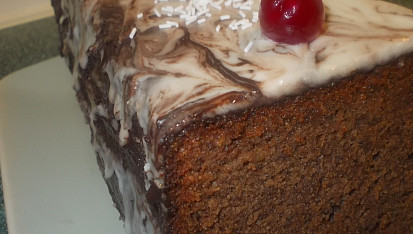 Krok 5: Necháme vychladnout, polijeme rozehřátou čokoládou.Pokapala jsem perníkový chlebíček cukrovou polevou, která mi zůstala od přípravy perníčků a udělala jsem duhovou /mramorovou polevu/.