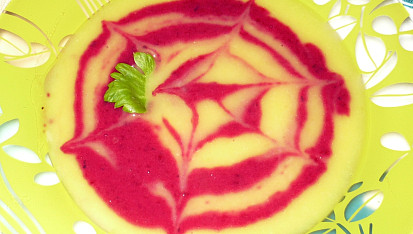 Do taniera lejeme striedavo do stredu cviklovú a dyňovú časť polievky. Ozdobíme lístkom zeleru.