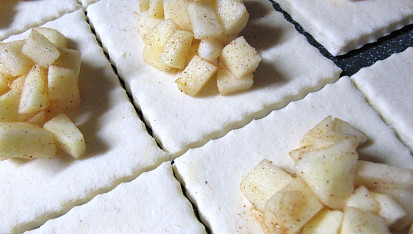 tvaroh, mouka hrubá, vejce, sůl, jablko, cukr skořice, šťáva citronová, olej, cukr moučkový, máslo